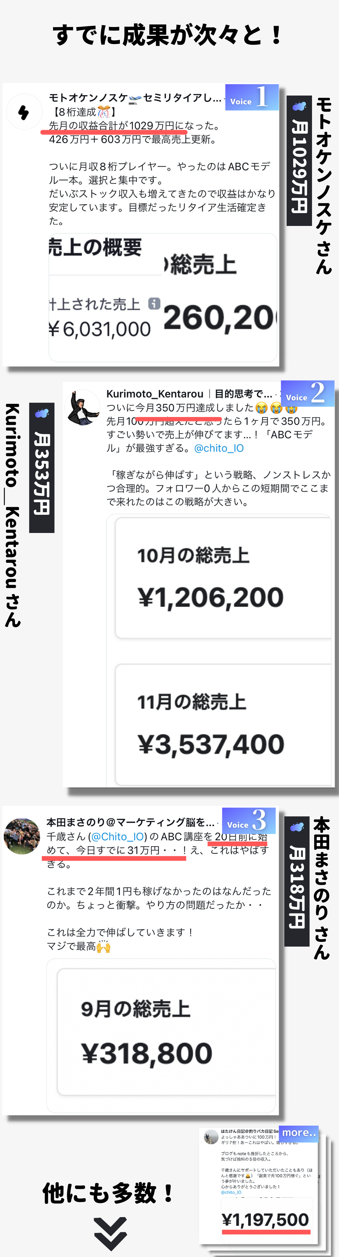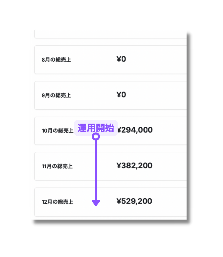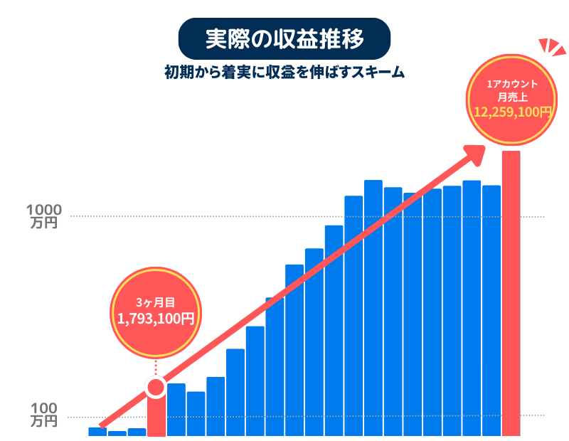 最もつまづきやすい初期の収益化から月間1000万円までを完全にモデル化することで、高い再現性を実現しました。